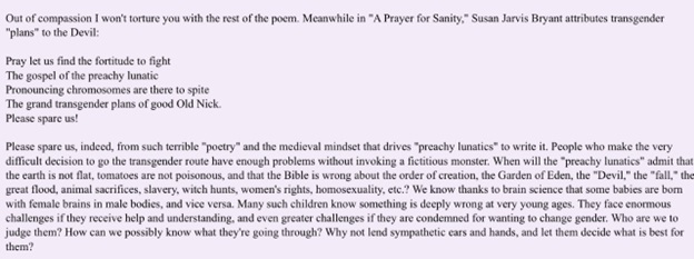 Joe, maybe Mr. Burch would like to debate the issue instead of taking a stanza of my poetry out of context on an internet site that doesn’t allow those torn down to react… all to get his fashionable point across. I have a feeling I am a little too optimistic on that front. Debate appears to be out of the question for anyone who pushes the transgender agenda. There is no defense for mutilating minors. Mr. Burch, as a regular visitor to our popular site, please prove me wrong!