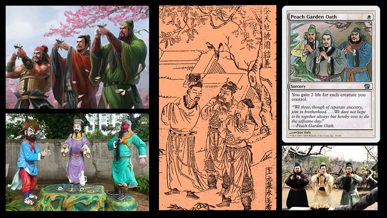 This oath of fellowship is an iconic moment in the first chapter of the historical novel Romance of the Three Kingdoms, by Luo Guanzhong (14th century), in which the main heroes of the novel pledge to restore goodness and order to a nation whose government is entrenched in corruption. The most recent television adaption of the popular work had this oath removed by communist censors in China.
