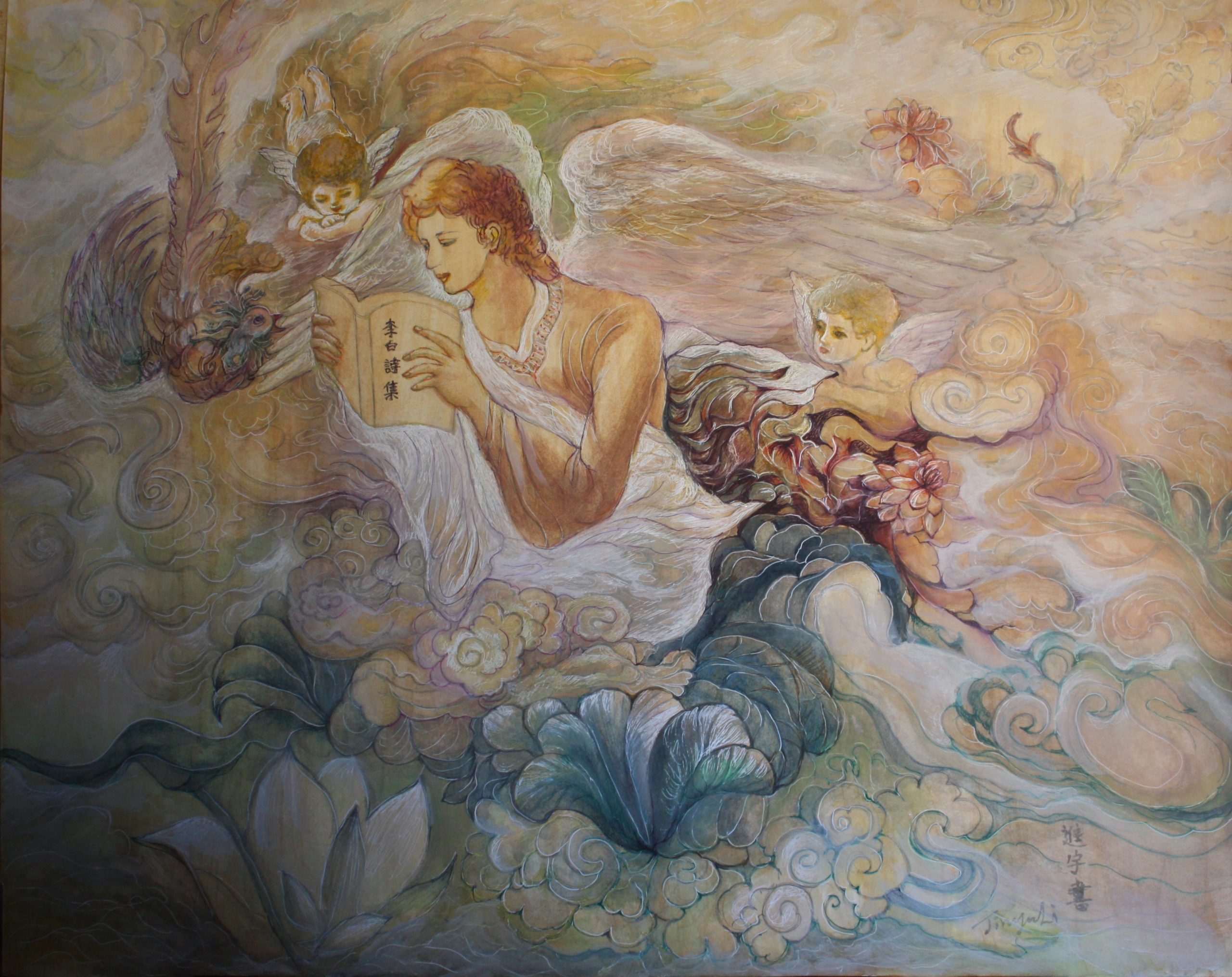 In this new work by Li Jinyu, of New York City, an angel reads poetry by Li Bai of the Tang Dynasty.