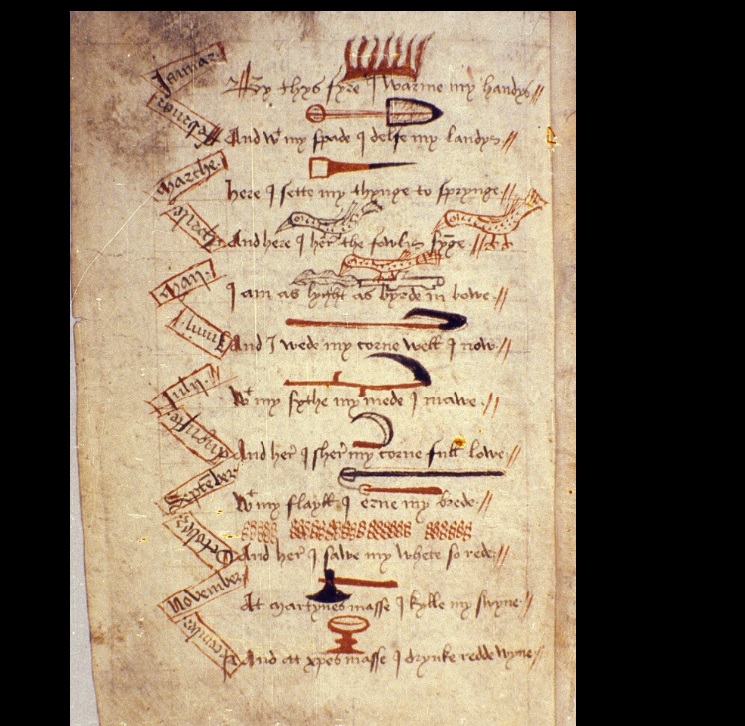 Another poet, not inscribing calendar pages but writing on a single sheet, lists the months in decorative boxes. He has no room to depict workers, but draws the tools they use between his lines. Here are the words from his Middle English poem of the 15th century.
