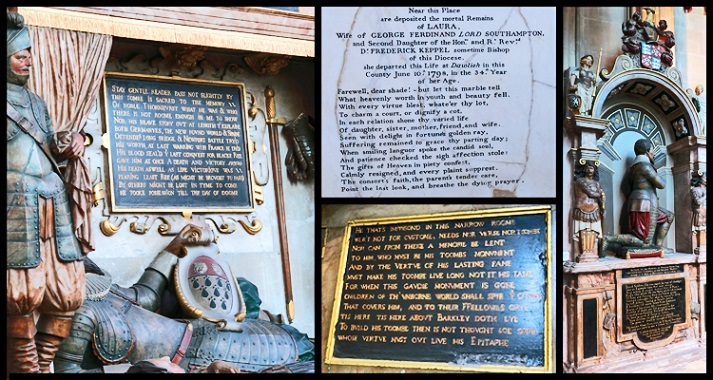 Interestingly enough, one can note the difference in the style of the last monument (to Laura, wife of Lord Southampton). The three earlier epitaphs are strongly 17th-century in style, spelling, and tone; and the first (to Berkeley) even has a whiff of the metaphysical manner about it. But Laura’s epitaph verse is pure 18th-century, with its personal, sentimental, and intimate portraiture. Thomas Gray, Alexander Pope, and Samuel Johnson had changed things.