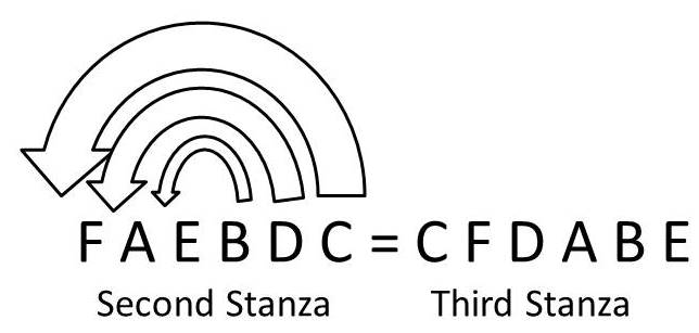 To generate the pattern for the second stanza, we take these letters and starting with the final one (F), we alternate picking up letters from the front and then the back until we have used all six. This gives us the following pattern for the second stanza: