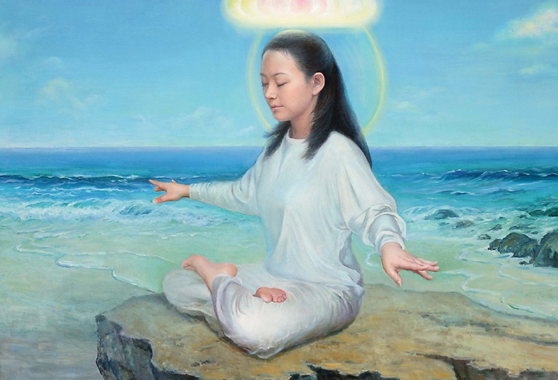 Featured Image: “In Harmony” by Xiaoping Chen. This painting depicts a young woman doing the fifth exercise of Falun Gong, “Way of Strengthening Divine Powers.” The clear water and blue sky reflect her tranquility and give a feeling of her union with heaven while she meditates.