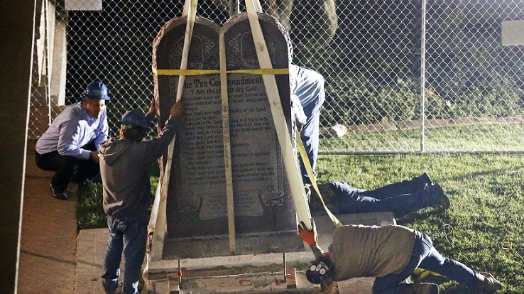 I remember reading that Master Cecil B. Demille promoted his film Ten commandments by pulling a publicity stunt and placing a granite replica of the Commandments placed outside the Texas Capital. The Fraternal Order of Eagles were glad to foot the bill. They thought it might prevent juvenile delinquency in 1951.