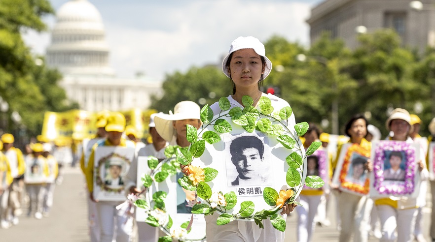 Falun Gong practitioners take part in a parade commemorating the 20th anniversary of the persecution of Falun Gong in China, in Washington on July 18, 2019. (Samira Bouaou/The Epoch Times)
